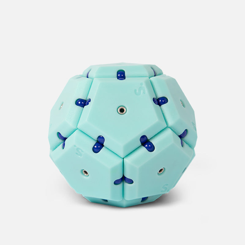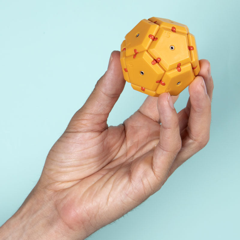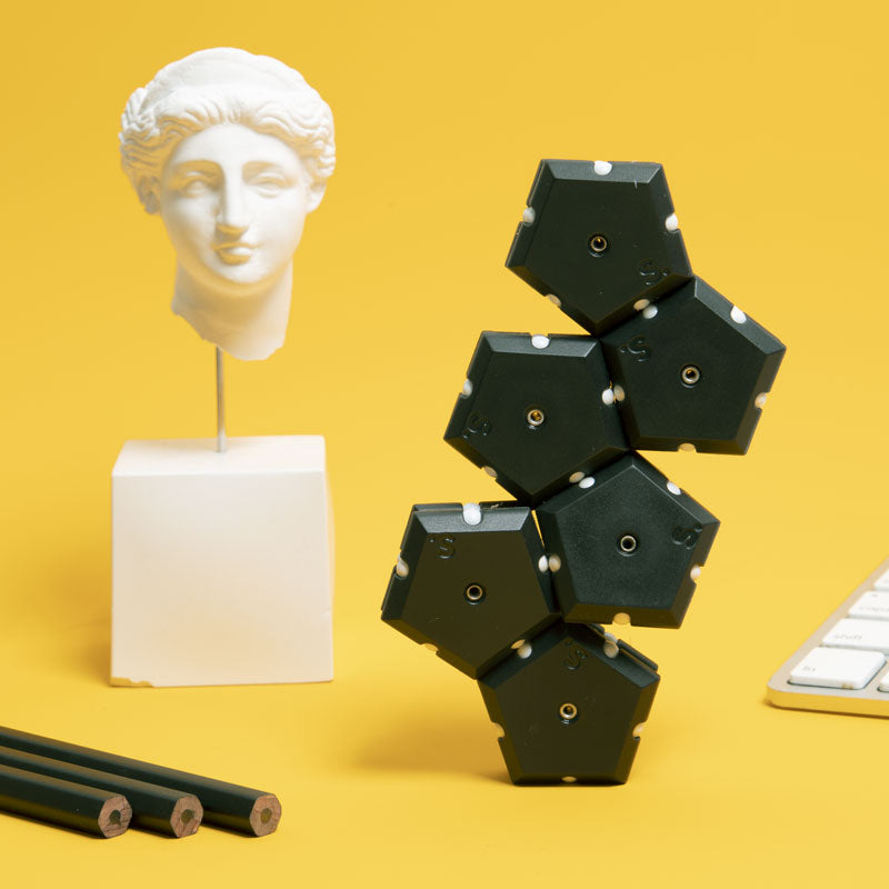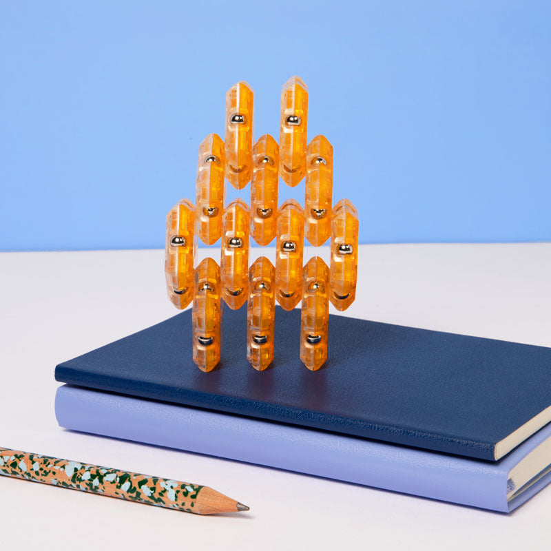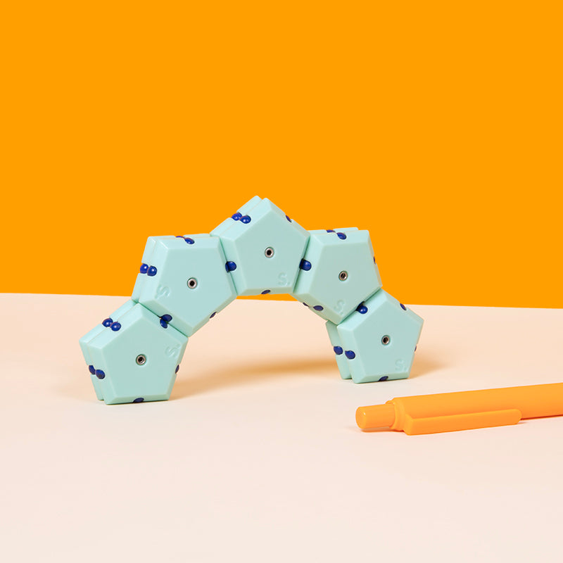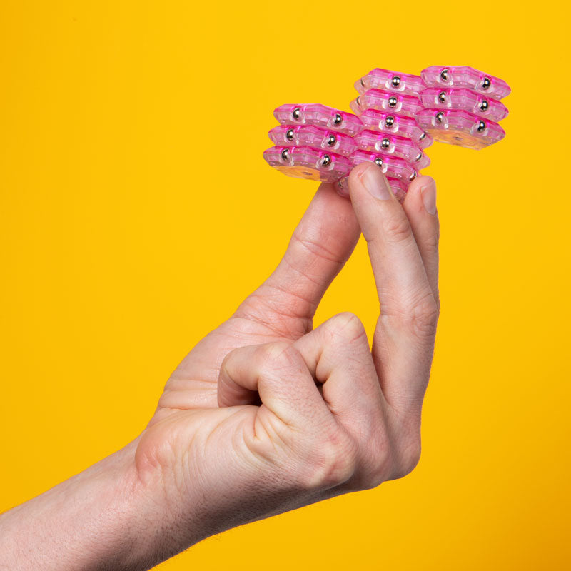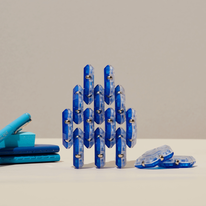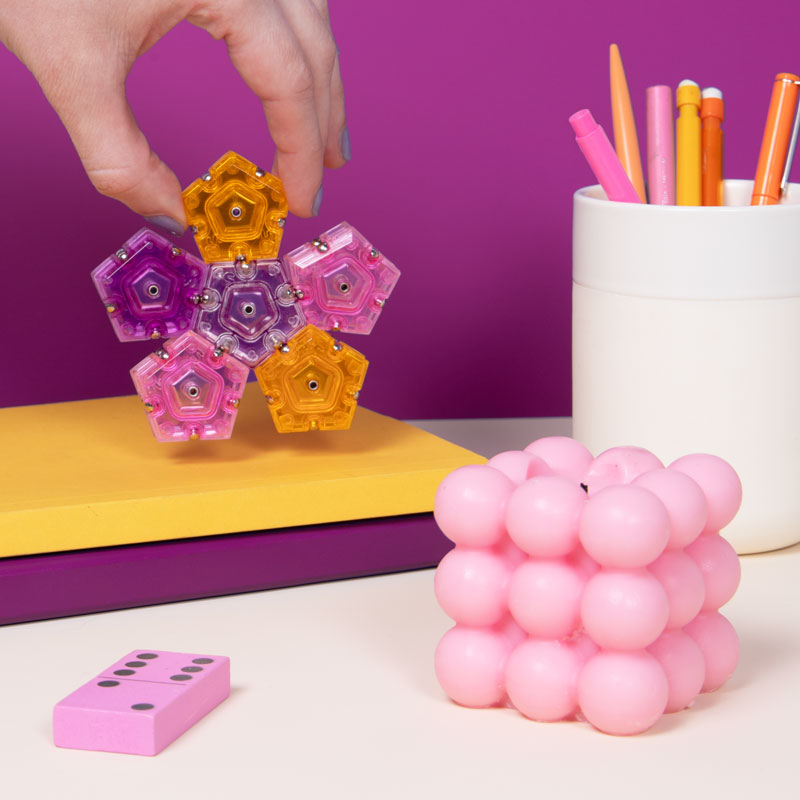On-the-desk or on-the-go, Geode is the perfect fidget desk toy. Each set includes 12 pentagons or triangles that align and snap into the perfect sphere. Combine colors and shapes for bigger builds and more fun!